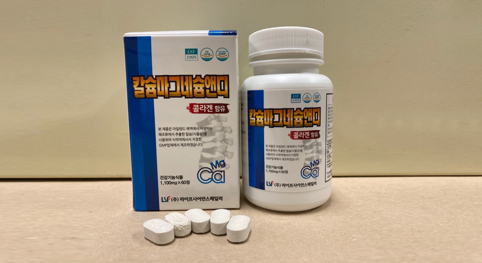 | 원재료명 및 함량 | 해조분말, 산화마그네슘, 비타민D3혼합제제분말, 산화아연, 황산망간, 콜라겐가수분해물, 아미노산 혼합분말, L-라이신염산염, 쇠뜨기추출물 등 |